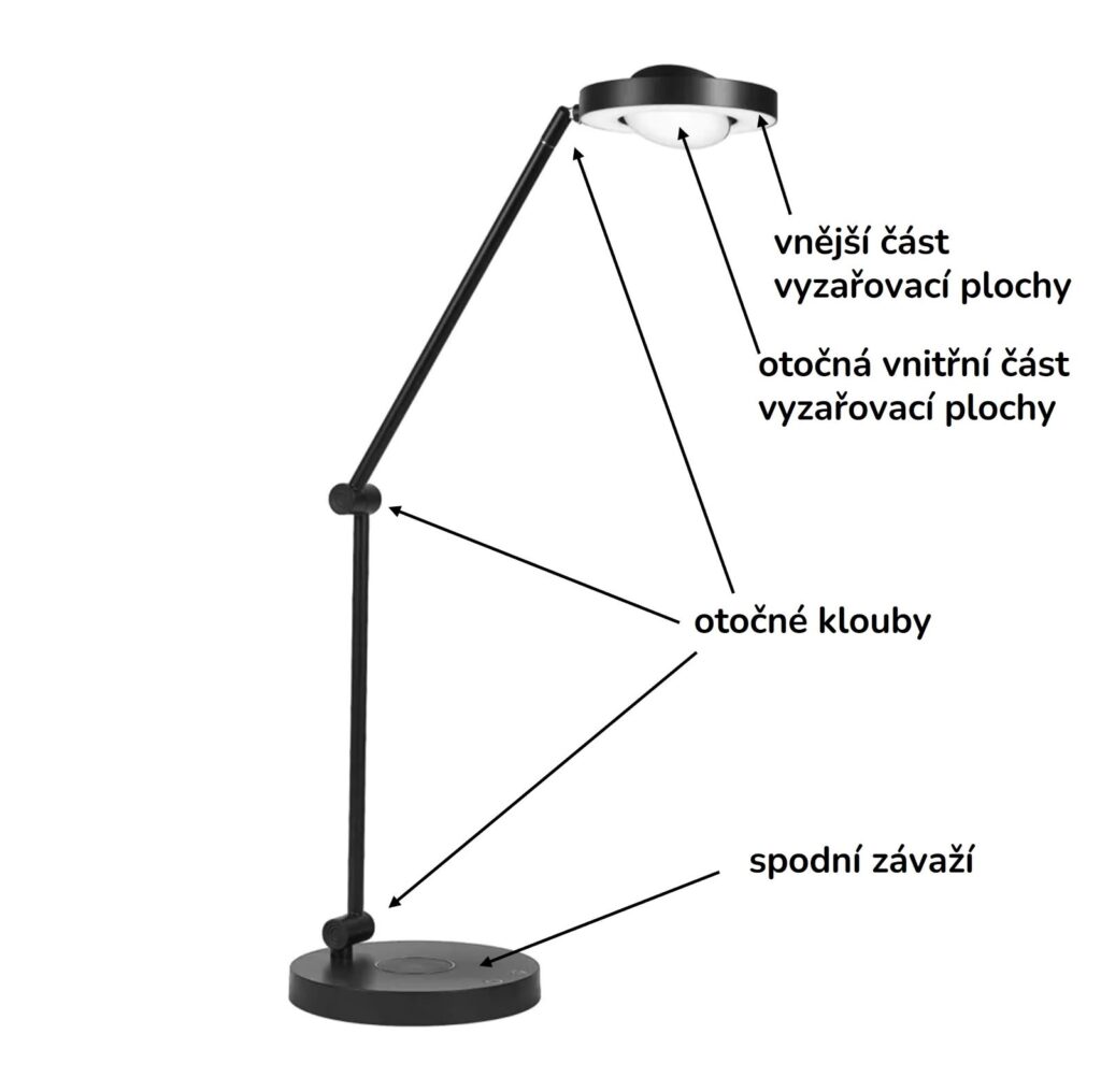 Stolní lampa disponuje třemi ohebnými klouby, díky kterým si můžete libovolně nastavit úhel dopadu světla. Plocha svítidla je rozdělena na vnitřní a vnější kruh, přičemž vnitřní kruh lze otáčet o téměř celých 360 °, díky čemuž si můžete jednoduše přizpůsobit směr osvětlení. Záleží tedy pouze na vás, zdali necháte původní přímý směr osvětlení (vnitřní i vnější kruh v jedné rovině), nebo otočením vnitřního kruhu vytvoříte nepřímé osvětlení, které bude mít dva směry.