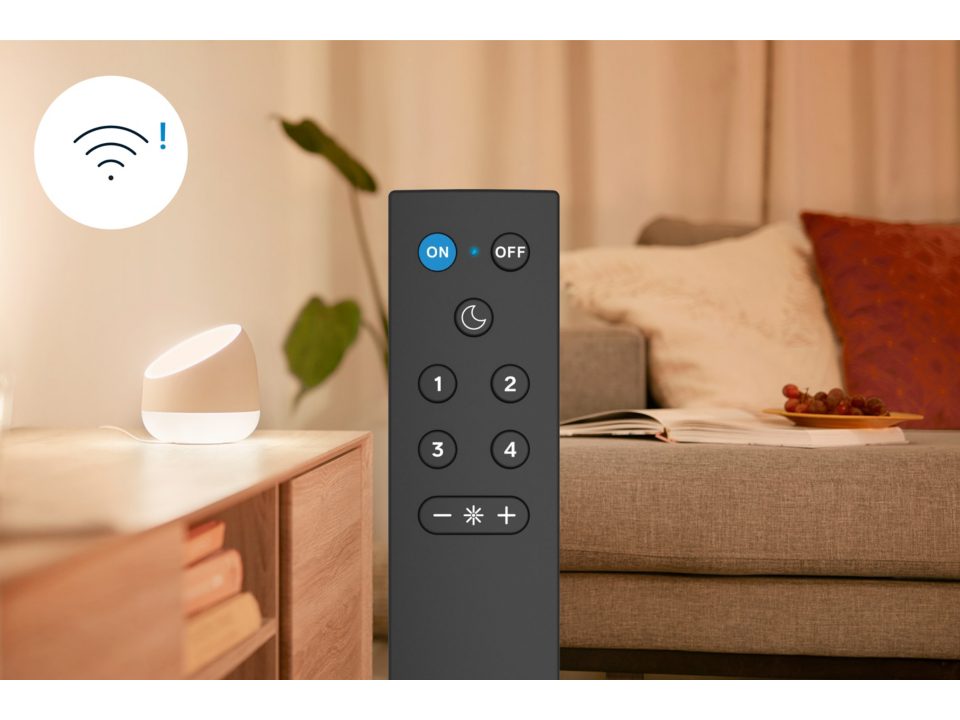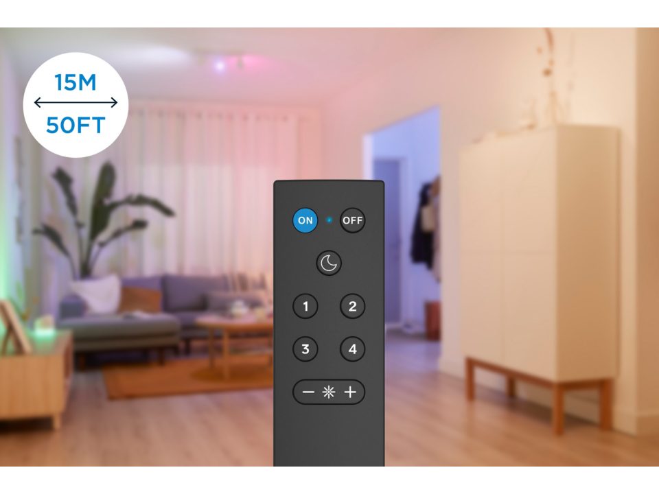 Ovládejte pomocí dálkového ovládání WiZmote svítidla WiZ ve vaší domácnosti, který je kompatibilní se všemi svítidly řady WiZ. Dálkovým ovládáním se dají svítidla zapnout, vypnout, můžete přidávat či ubírat intenzitu osvětlení nebo nastavit noční mód. Zároveň si můžete nastavit čtyři oblíbené světelné scény na tlačítkách 1-4. Vypadlo vám WiFi připojení a vy nemůžete ovládat svítidla řady WiZ přes mobilní aplikaci WiZ. Využijte právě dálkového ovládání, které není závislé na Wi-Fi. Rovněž oceníte široký dosah ovládání svítidel, který činí 15 metrů. Ovladač je napájen přes AAA baterie.