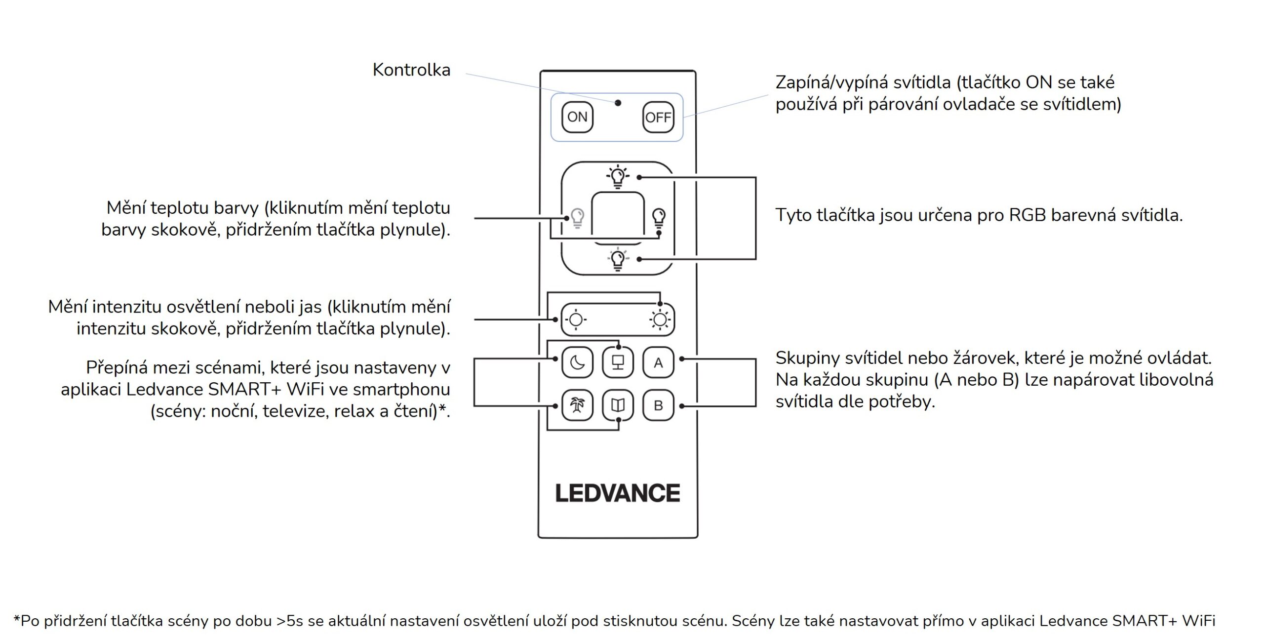 - Přepíná mezi scénami, které jsou nastaveny v aplikaci Ledvance SMART+ WiFi ve smartphonu (scény: noční, televize, relax a čtení). Po přidržení tlačítka scény po dobu >5s se aktuální nastavení osvětlení uloží pod stisknutou scénu. Scény lze také nastavovat přímo v aplikaci Ledvance SMART+ WiFi.