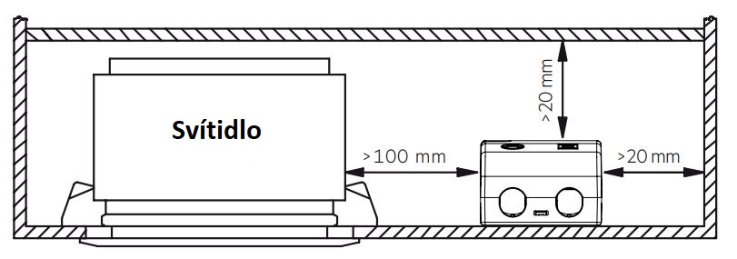 Zdroj je určen pro provoz v suchém prostředí, bez kyselin, olejů, tuků. Při provozu nesmí teplota okolí překročit 45°C. S rostoucí teplotou okolí se snižuje životnost zdroje. Minimální vzdálenosti uvedené níže jsou doporučené a závisí na konkrétním svítidle. Není vhodné pro upevnění v rohu. Zdroj není dovoleno zakrývat (např. izolací v podhledech).