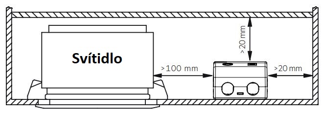 Zdroj je určen pro provoz v suchém prostředí, bez kyselin, olejů, tuků. Při provozu nesmí teplota okolí překročit 50°C. S rostoucí teplotou okolí se snižuje životnost zdroje. Minimální vzdálenosti uvedené níže jsou doporučené a závisí na konkrétním svítidle. Není vhodné pro upevnění v rohu. Zdroj není dovoleno zakrývat (např. izolací v podhledech).