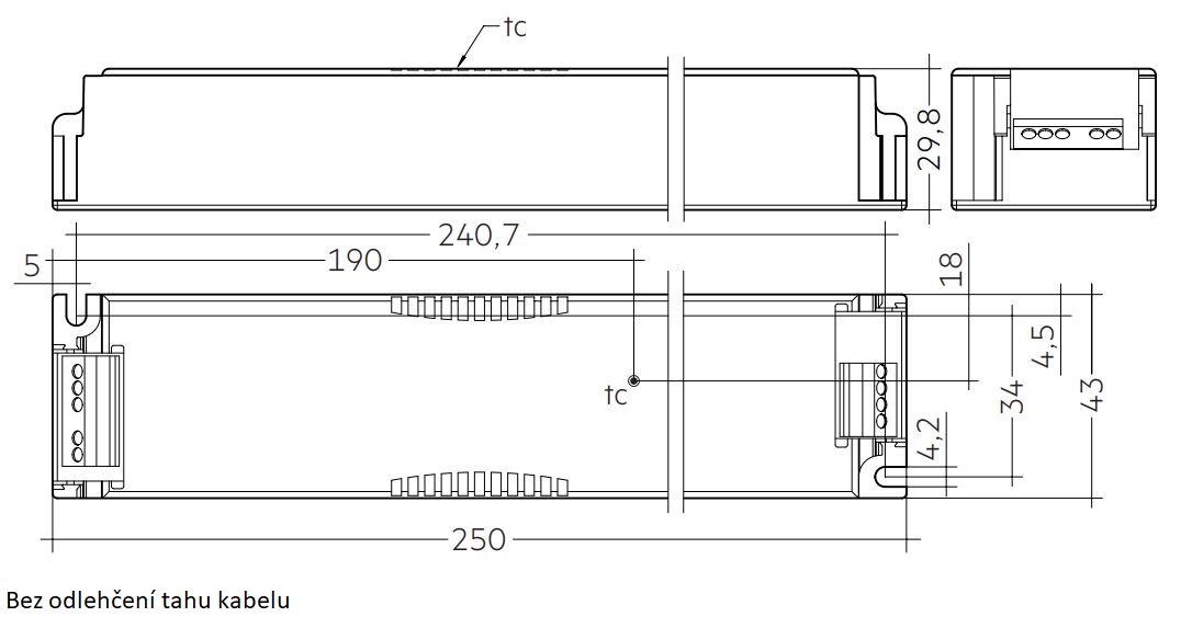 - Zdroj nemá na výstupní straně ochranu proti opačné polaritě svítidla. Špatná polarita na straně svítidla může poškodit svítidlo.