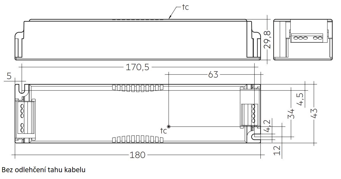 - Zdroj nemá na výstupní straně ochranu proti opačné polaritě svítidla. Špatná polarita na straně svítidla může poškodit svítidlo.