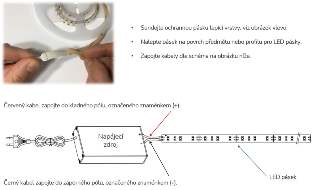 Následně použijte nový kabel s konektorem – přiložen v balení s LED páskem. Při zapojení dodržujte správné označení (+) pro červený vodič a (-) pro černý vodič.
