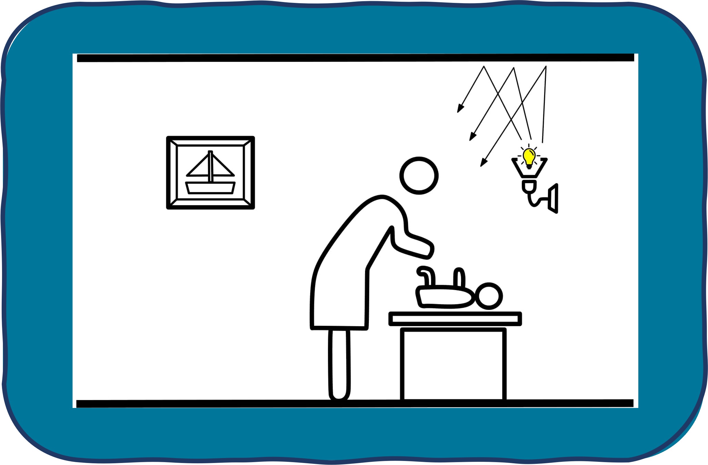 Světlo vycházející ze žárovky nejprve dopadá na strop/stěny místnosti a následně se od stropu odráží a osvětluje tak přebalovací pult. Jedná se o nepřímé osvětlení a všem ho doporučujeme.
