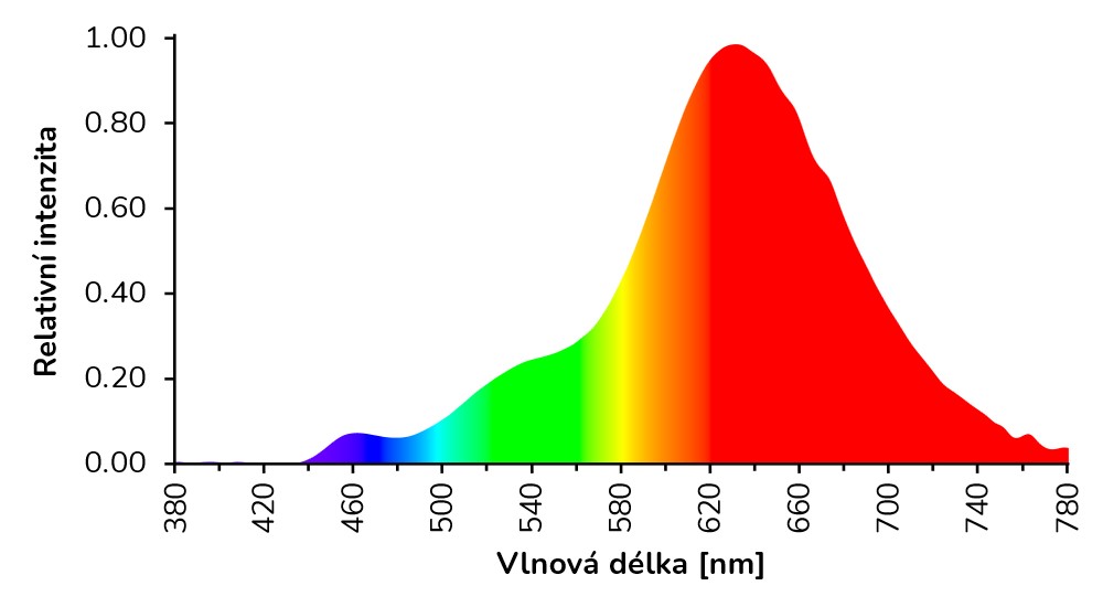 Množství modrého světla při teplotě barvy 2200K. Takový poměr modrého světla má právě LED žárovka Ledvance E27 2,5W 2200K.