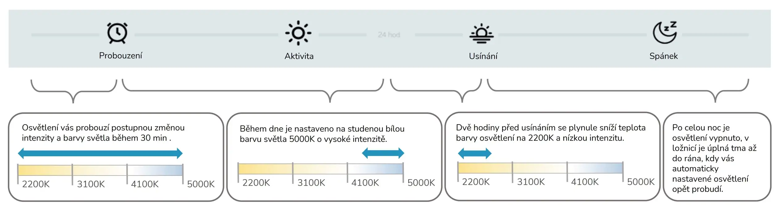 LED žárovka dokáže měnit intenzitu osvětlení (jas) a teplotu barvy světla v odlišných částech dne. Při svícení v dopoledních a odpoledních Číst vícehodinách má stimulační účinky vedoucí k vyšší produktivitě práce, lepší koncentraci a pozitivní náladě. Plnospektrální žárovka SUN@Home vyvolává tyto efekty pomocí vysoké intenzity osvětlení a studené bíle barvy světla. Ve večerních hodinách teplota přejde na teplou žlutou barvu a sníží se intenzita. Tyto vlastnosti světla dopomáhají k odpočinku před spánkem. Díky blokaci modrého světla dvě hodiny před usínáním dosáhnete kvalitnějšího spánku. Žárovka je kompatibilní s aplikací LEDVANCE SMART + WiFi, díky které lze nastavit vlastnosti světla podle vašeho denního režimu.