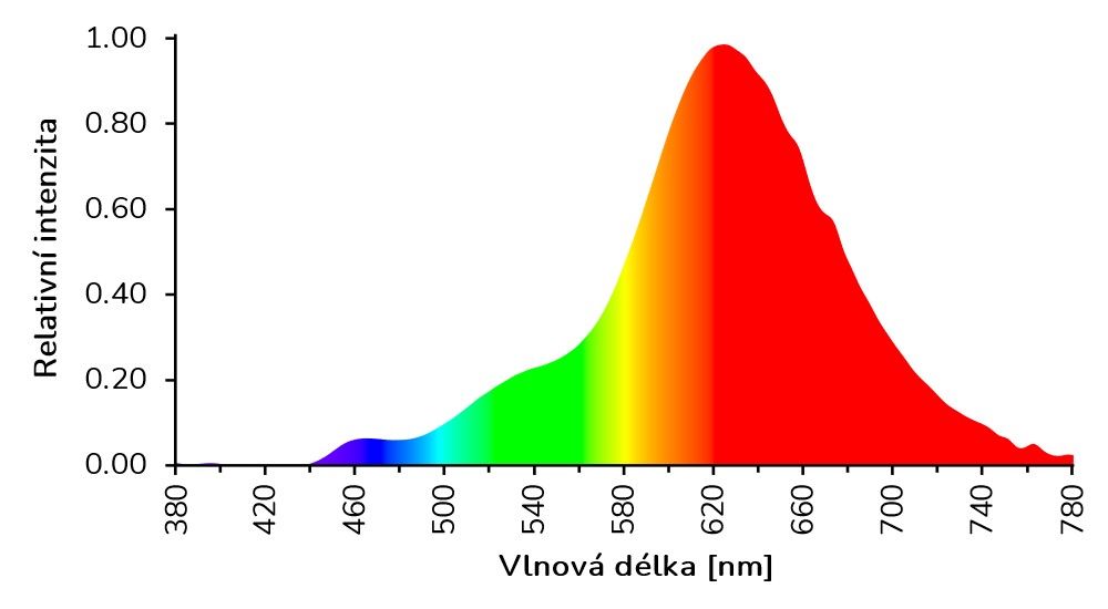 Množství modrého světla při teplotě barvy 2200K. Takový poměr modrého světla má právě LED žárovka Ledvance E27 2,5W 2200K.