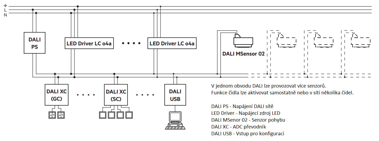 V jednom obvodu DALI lze ovládat maximálně 12 senzorů. Toto omezení je způsobeno povoleným datovým provozem na okruhu DALI.