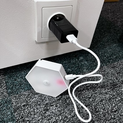 Použití: Adaptér jednoduše připojíte přes USB port a je ihned připraven k použití. Stav nabíjení poznáte podle kontrolky na svítidle – u večerní lampy ORANŽOVKY svítí při nabíjení červeně a po nabití zeleně, u nočního světla ORANŽOVKA svítí při nabíjení červeně a po nabití kontrolka zhasne.