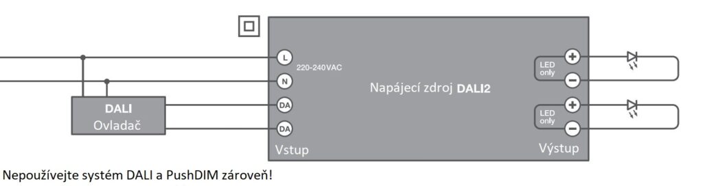Napájecí zdroj je ovládán prostřednictvím ovladače, který je součástí sítě DALI-2. Více informací je k dispozici v článku Ovládání světel pomocí DALI sběrnice.