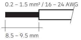 Pro optimální funkci pružinových svorek je délka odizolovaného konce vodiče 8,5 – 9,5mm.