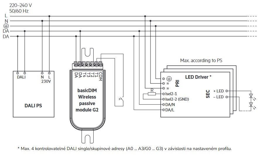 Pasivní řídící modul G2 CASAMBI využívá napájení přímo z DALI linky. Z tohoto důvodu je důležité se přesvědčit, že je DALI linka externě napájena.