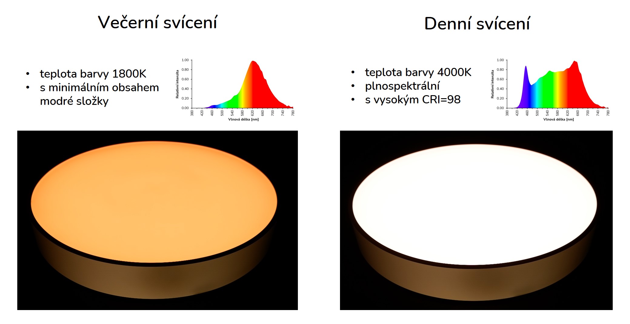 Pro večerní a noční svícení zvolte teplotu barvy 1800 K. Neobsahuje téměř žádnou modrou složku světla a podobá se světlu zapadajícího slunce. Večer uklidní vaše tělo i mysl po celodenním výkonu a připraví vás na řádný odpočinek. Navíc nenarušuje tvorbu spánkového hormonu, což přispívá ke zkvalitnění vašeho spánku.