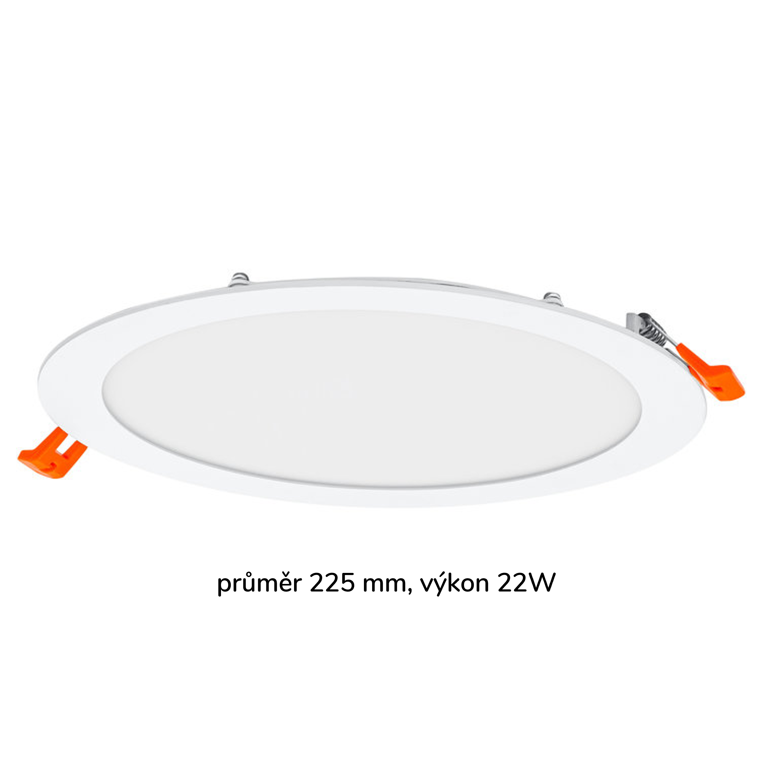 - 225 mm (průměr), 22W (výkon) – Verzi s největším průměrem doporučujeme zabudovat do místností, kde trávíte v průběhu dne nejvíce času. Své využití najde v obývacích pokojích, kuchyních, koupelnách, kancelářích a menších pracovnách. Všeobecně pak platí, že varianta 225 mm, 22W se montuje do velkých místností, kde je potřeba hodně světla.