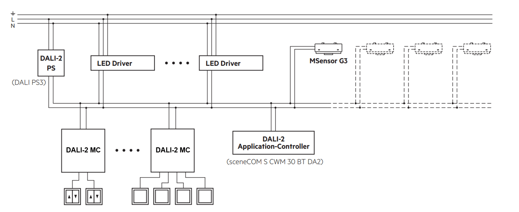 - DALI-2 MC je plně kompatibilní s aplikačním kontrolerem BT přijímač sceneCOM S DALI-2 , kde konfigurace DALI sítě probíhá pomocí aplikace na jakémkoliv tabletu nebo chytrém telefonu. Tablet nebo chytrý telefon je pak s BT přijímač sceneCOM S DALI-2 propojen pomocí bluetooth.
