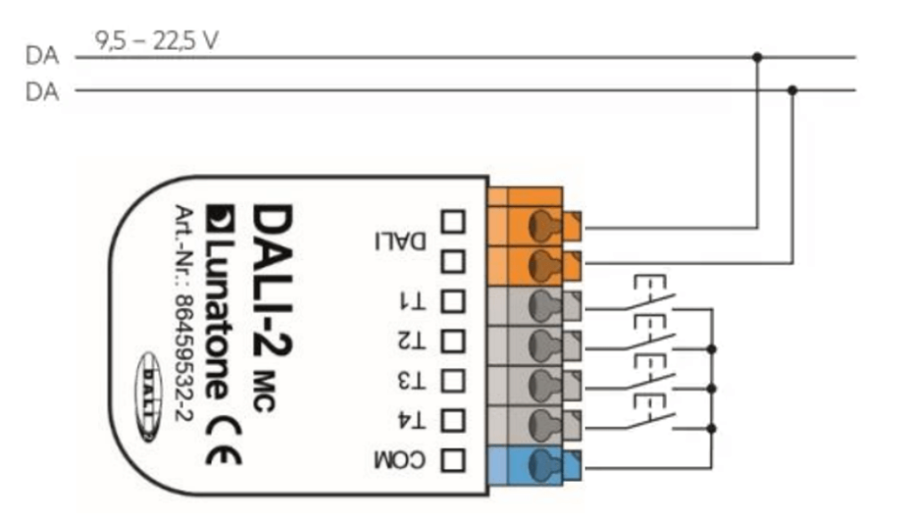- Spínače jsou připojeny přímo k DALI-2 MC. Nesmí být připojeny k síti 230V.