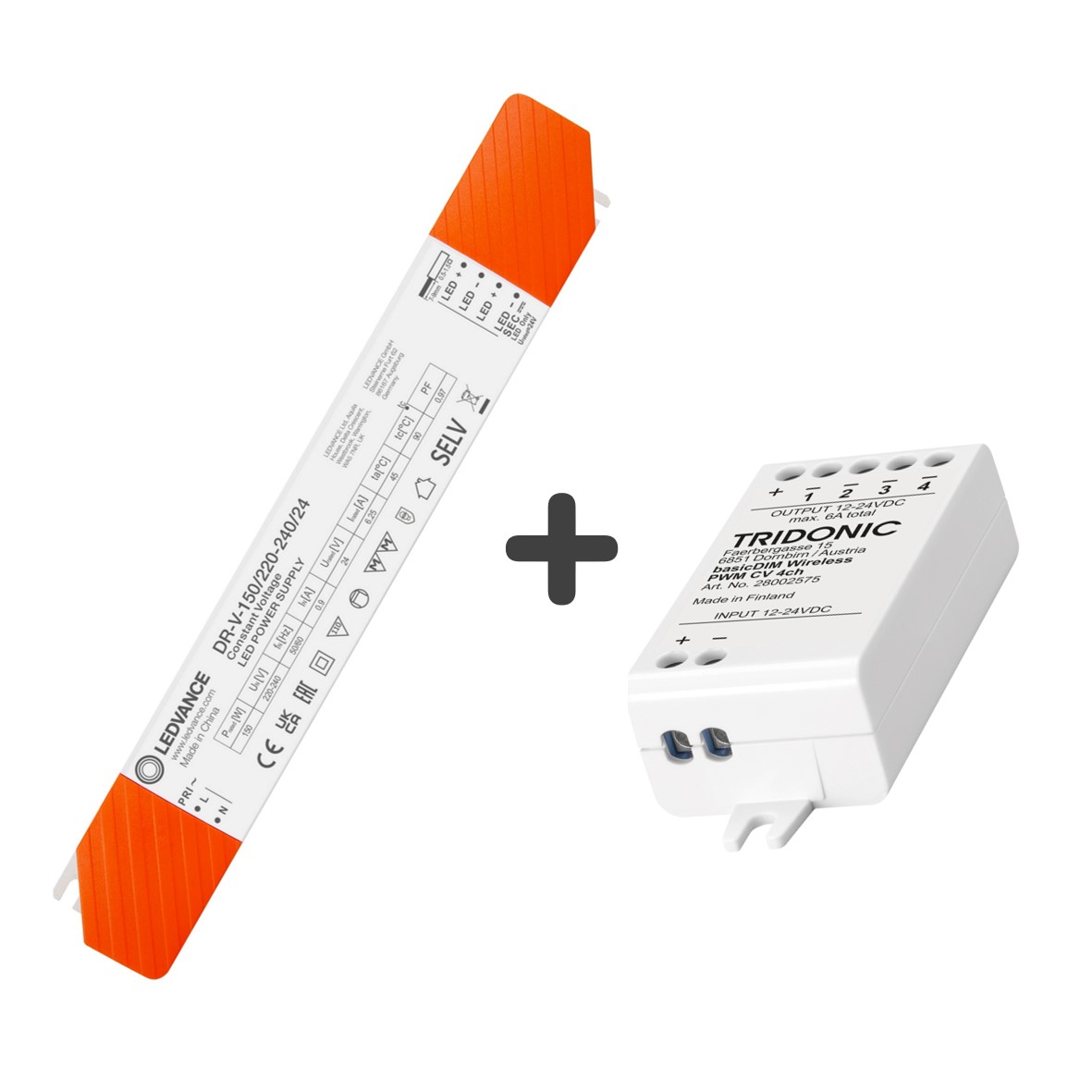Set se skládá z bezdrátového modulu Casambi 4CH (Tridonic označení: basicDIM Wireless PWM CV 4CH) a napěťového Napájecího zdroje Ledvance 150W 24V .