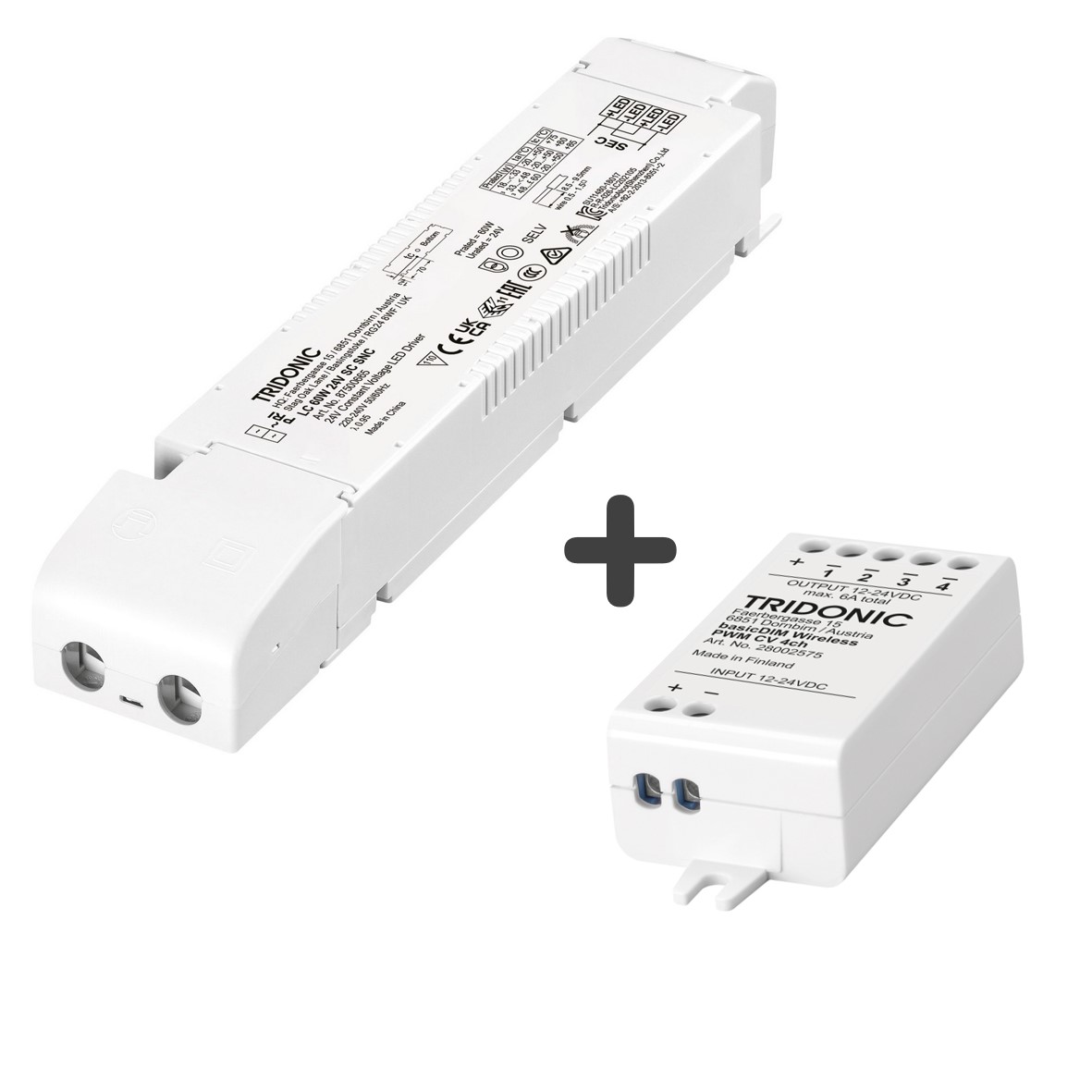 Set se skládá z bezdrátového modulu Casambi 4CH (Tridonic označení: basicDIM Wireless PWM CV 4CH) a napěťového Napájecího zdroje 60W 24V SNC.