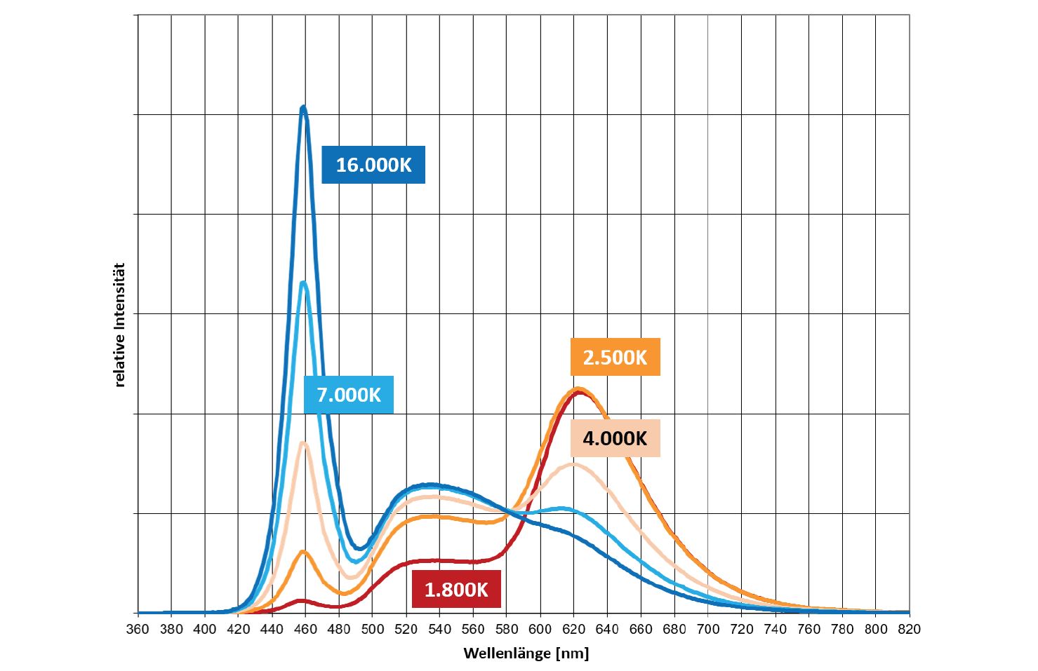 - Individualní volba vyzařované barvy dle RGB souřadnic v rámci PI2-LED barevných palet umožňuje nastavit teplotu chromatičnosti v rozmezí 1800 K až 16 000 K.